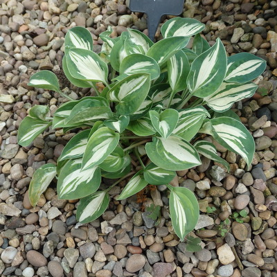 Miniature (AHS) Hosta. Ht. around 4”. Leaves (2”x1.5”) have a dark green margin streaking towards a white centre. Pale lavender flowers. Beautiful but needs care until established. Hansen/Shady Oaks 1996. £10.00