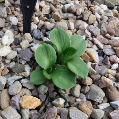 Miniature (AHS) Hosta. Ht. about 3in. Rounded green leaves (1in.x1in.). Lavender flowers. H. Cracker Crumbs x H. Blue Mouse Ears hybrid. Avent, 2020. £15.00.