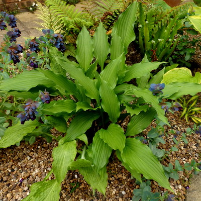 Medium Hosta. Ht. around 14”. Long narrow green leaves with a very wavy edge. Red petioles. Lavender flowers. Terpening. Not registered. £10.00.