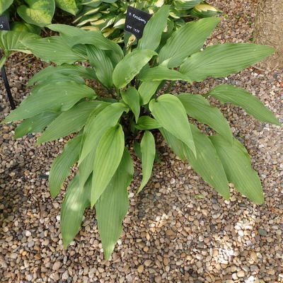 Medium Hosta. Ht. about. 15in. Long, narrow, dark green slightly wavy leaves (10in.x 2.75in.) on dark petioles.  Lavender flowers. H. Curly Fries x H. Tokyo Smog seedling. Originators stock.  Sue Proctor Plants 2019.  £20.00