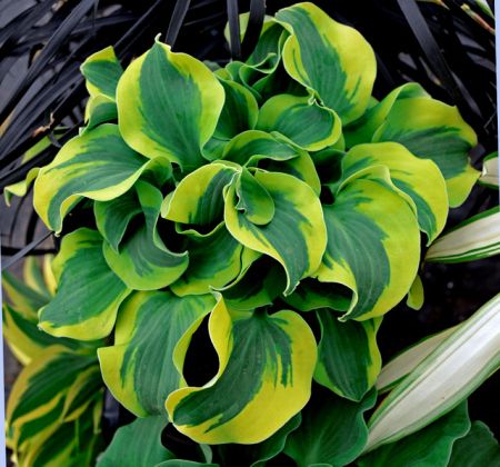 Miniature (AHS) Hosta. Ht. about 6”.  Thick blue-green leaves with a wide, wavy yellow margin.. The margin needs some time to turn yellow. Lavender flowers. A sport of H. ‘Church Mouse’  Walters Gardens. Not registered. £15.00.