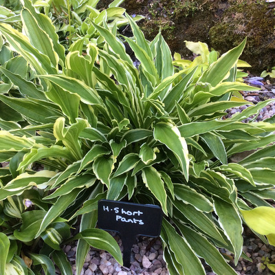 Small Hosta. Ht. about 9”. Satiny green lance-shaped, rippled leaves with a narrow yellow margin. Purple striped flowers. Like a slightly smaller Stiletto. Not registered. £10.00.