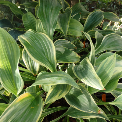 Large Hosta. Ht. about 20”. Arching blue-green leaves with a yellow margin streaking into the centre. Forms an upright mound. Stunning. Lavender flowers. Sport of H. ‘Kathie Sisson’. Goodenough. Not registered £14.00.