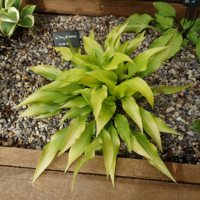 Very small Hosta. Ht. about 8”. Yellow leaves (4.5×1.5”) turning to chartreuse later in the season. Lavender flowers. H. ‘Corkscrew’ x H. ‘Lemon Frost’ hybrid. Solberg, 2008. £10.00