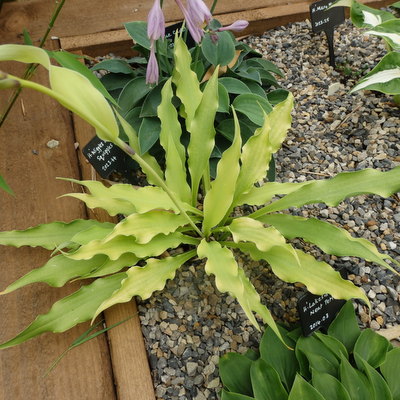 Very small Hosta. Ht. about 9in. Long, narrow gold leaves (6in.x1.7in.) with a very wavy edge. Mid-purple flowers. Hansen, 2019. £12.00.